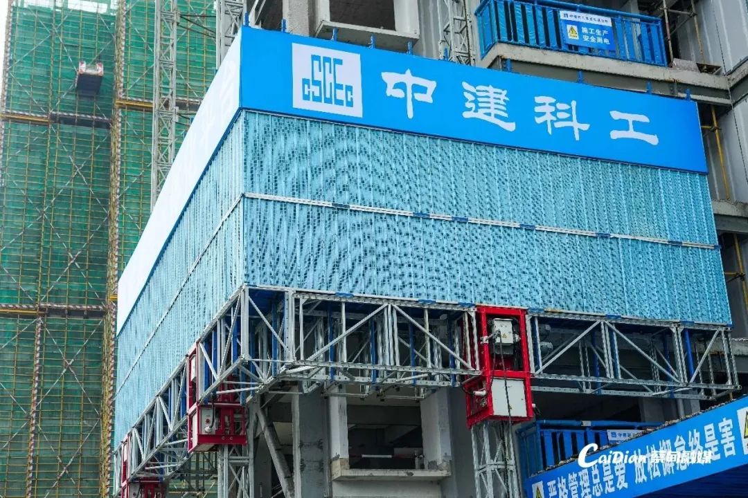 中建科工自主研发的智能建造一体化平台由立柱与导轨系统、钢平台与防护系统、施工电梯系统构成,集外层防护、操作平台、电动吊篮、施工电梯、悬挑料台等功能于一体,不仅可以满足施工全周期安全防护需求,还可以为后续外墙装修等工序提供作业平台。