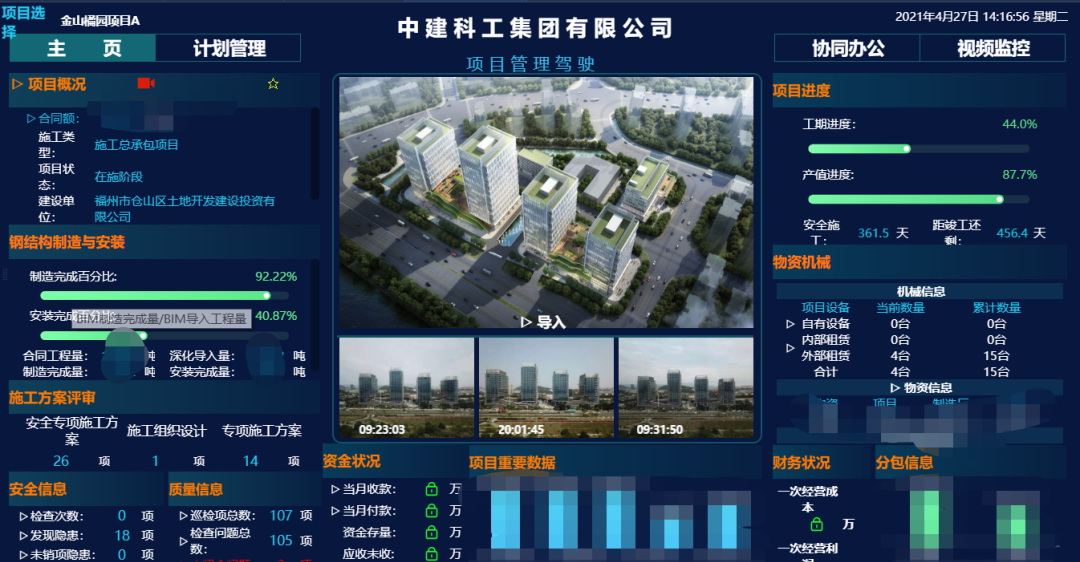 中建科工研发的智慧工地管理驾驶舱集合项目概况平台(展示项目每日施工建设情况)、远程作战指挥平台(对施工现场进行远程监管)、BIM应用平台(对施工现场实施全景式智能巡查)、要素管理平台(可高效进行人员管理、安全预警)等四大平台,具备企业多系统数据集成能力及各类智能终端接入功能,助力项目实现全周期运行数据实时监测。