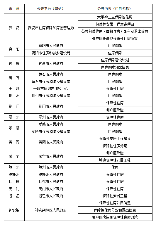 备注:各市、州、直管市、神农架林区保障性安居工程项目建设和保障性住房分配等方面信息由各地政府及部门网站公开。