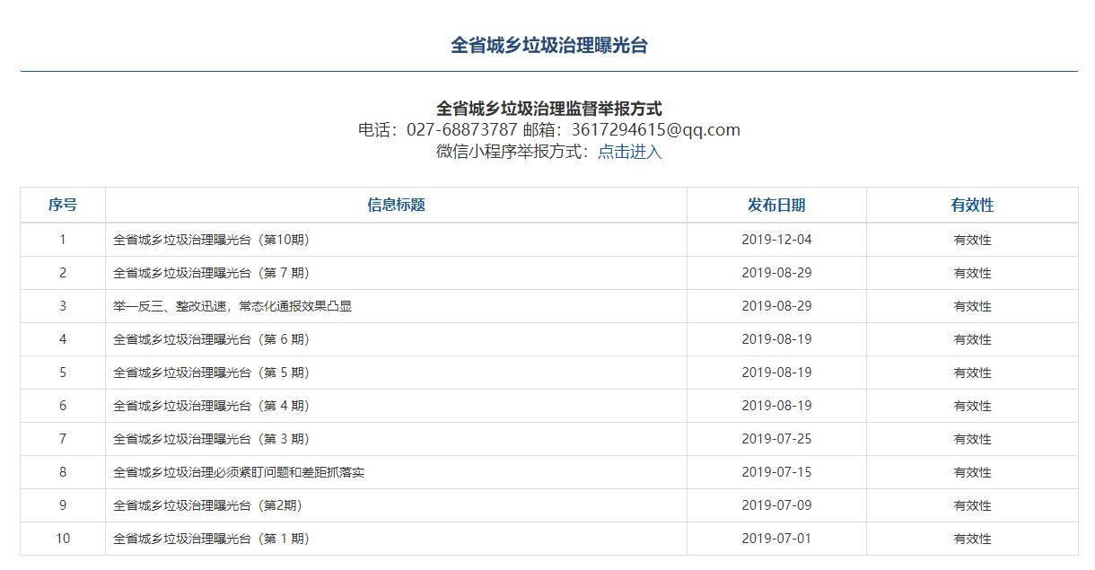 3.城乡生活垃圾无害化处理。2019年,继续做好《湖北省城乡生活垃圾无害化处理全达标工作简报》发布工作,及时公开工作进展情况。同时,建立湖北城乡垃圾治理监督举报平台,以图文结合的形式,集中发布市县城乡垃圾治理和“一把扫帚扫到底,干干净净迎国庆”等活动督查情况。通过做爱漫画 网站、《湖北日报》等媒体发布全省城乡垃圾治理曝光台信息8个批次。2019年7月,央视《新闻联播》节目“不忘初心、牢记使命”主题教育进行时部分报道了我厅开展垃圾治理工作情况。