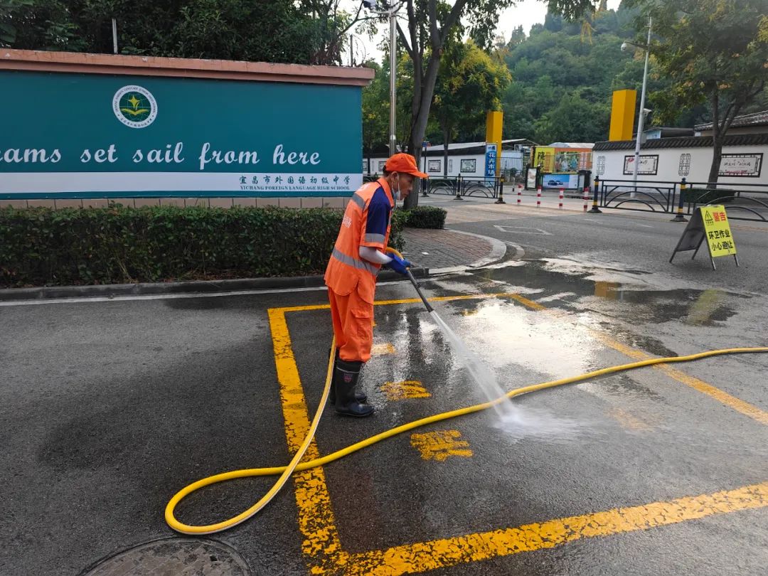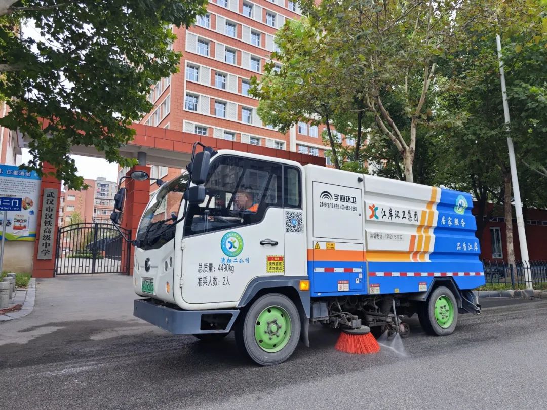 为营造干净整洁的校园周边环境,武汉市汉阳环卫集团错峰开展清洗作业,利用开学季前暑假期间人流量少的空档,采用“人机结合”的方式,对学校周边“强力度”清洗,主次干道全面清洗,人行道及公共设施、城市家具精细化人工清洗。