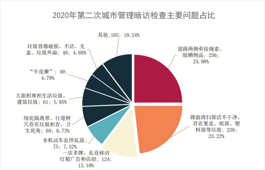 在各级领导重视、市民配合和城管人员的辛勤付出下,第二次城市管理暗访检查工作于2020年8月5日至8月31日完成。本次暗访检查发现问题共计1025处,问题主要为道路两侧牵挂绳索、晾晒物品(256处,占问题总数的24.98%);路面清扫保洁不干净,存在果皮、纸屑、塑料袋等垃圾(238处,占问题总数的23.22%);一店多牌、乱设移动灯箱广告和店招(124处,占问题总数的12.10%);非机动车乱停乱放(75处,占问题总数的7.32%);绿化隔离带、行道树穴存在垃圾积存、卫生死角(69处,占问题总数的6.73%);巡查:大面积堆积生活垃圾、建筑垃圾(61处,占问题总数的5.95%);“牛皮癣”(49处,占问题总数的4.78%);垃圾容器破损、不洁、无盖、垃圾外溢(48处,占问题总数的4.68%);其他问题(105处,占问题总数的10.24%)。