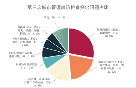 在各级领导重视、市民配合和城管人员的辛勤付出下,第三次城市管理暗访检查工作于2020年9月25日至10月20日完成。第三次暗访检查发现问题共计775处,问题数相较于第二次暗访检查下降了24.39%。从检查情况上看,各城市都加大了管理和治理力度,市容市貌继续保持整洁有序。但仍存在一些突出问题,如“道路两侧牵挂绳索、晾晒物品”、“路面废弃物”、“一店多牌、乱设移动灯箱广告和店招”、“非机动车乱停乱放”、“巡查发现大面积堆积生活垃圾、建筑垃圾”和“垃圾容器破损、不洁、无盖、垃圾外溢”,分别占到问题总数的28.00%、20.52%、16.65%、7.35%、6.58%和5.68%。