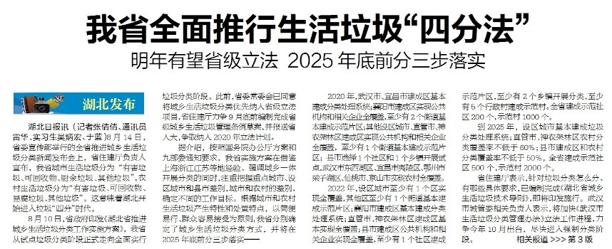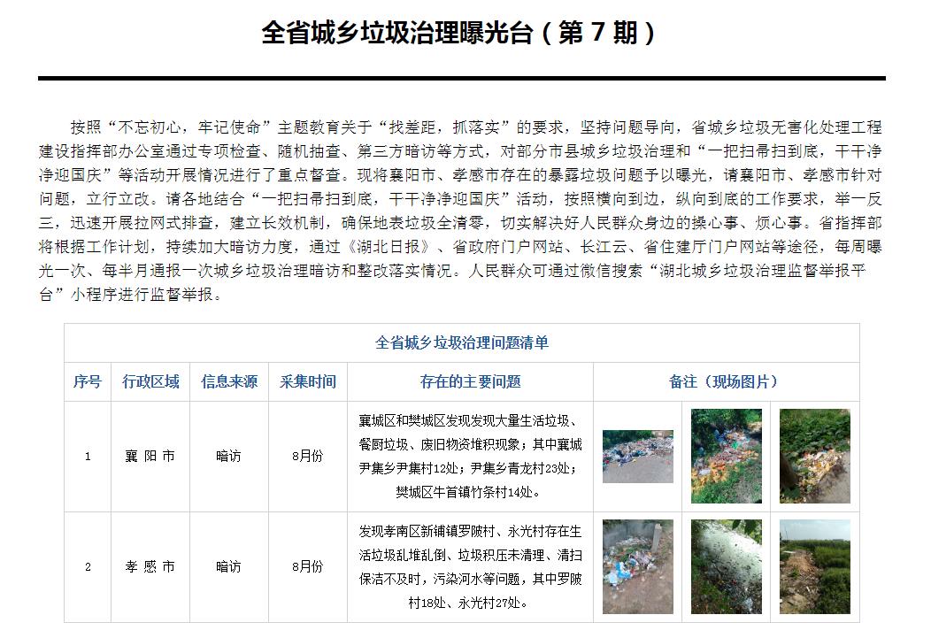 3.城乡生活垃圾无害化处理。2019年,继续做好《湖北省城乡生活垃圾无害化处理全达标工作简报》发布工作,及时公开工作进展情况。同时,建立湖北城乡垃圾治理监督举报平台,以图文结合的形式,集中发布市县城乡垃圾治理和“一把扫帚扫到底,干干净净迎国庆”等活动督查情况。通过做爱漫画 网站、《湖北日报》等媒体发布全省城乡垃圾治理曝光台信息8个批次。2019年7月,央视《新闻联播》节目“不忘初心、牢记使命”主题教育进行时部分报道了我厅开展垃圾治理工作情况。