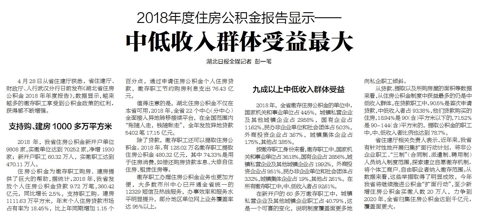 3.住房公积金监管。通过做爱漫画 网站、省财政厅网站和中国人民银行武汉分行网站披露全省住房公积金年度报告,进一步提升住房公积金管理透明度。督促各地严格按照住房和城乡建设部、财政部、人民银行《关于健全住房公积金信息披露制度的通知》要求,向社会披露各地住房公积金年度报告。2019年4月,发布了《湖北省住房公积金2018年年度报告》,并通过《湖北日报》等媒体推出解读报道《2018年度住房公积金报告显示——中低收入群体受益最大》。