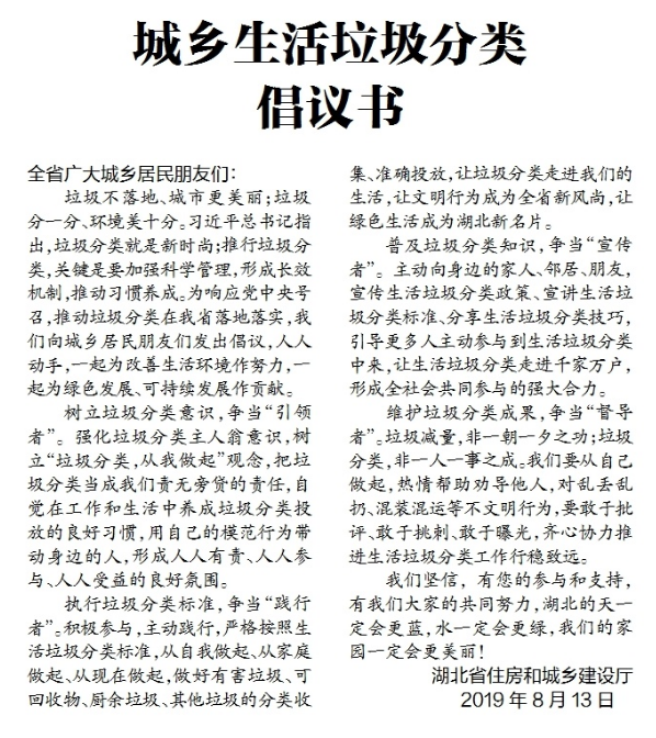 四是加强政策解读和回应关切信息公开。按照“谁起草谁解读”原则,重要政策出台、重点工作推进、重大事件发生时,对人民群众、市场主体和媒体关注度高的内容开展跟进解读。对涉及群众切身利益、容易引起社会关注的政策文件,提前做好舆情风险评估研判,加强舆情监测、研判、回应,及时解释疑惑。2019年,重点围绕“一把扫帚扫到底 干干净净迎国庆”活动、《湖北省工程建设项目审批制度改革实施方案》、《湖北省推进城乡生活垃圾分类工作实施方案》、《湖北省开展工程建设领域专业技术人员职业资格“挂证”等违法违规行为专项整治工作实施方案》、《湖北省房屋市政工程安全监督动态扣分管理办法(试行)》、《湖北省城市管理执法行为规范细则》《湖北省建设工程联合竣工验收暂行办法》、《湖北省城镇小区配套幼儿园建设管理办法(试行)》、《湖北省建筑业企业市场行为监督办法(暂行)》《湖北省工程质量安全手册实施细则(试行)》等,通过网站、报刊全文发布、专家解读等形式,推出了一系列解读、回应信息。特别是在垃圾分类引起社会强烈关注和讨论之后,我厅联合省人民政府门户网站、《湖北日报》等媒体,集中推出《城乡生活垃圾分类倡议书》《我省全面推行生活垃圾“四分法”》等报道,扩大公众的知晓率,提升居民的参与度,推进垃圾分类工作的有效实施。