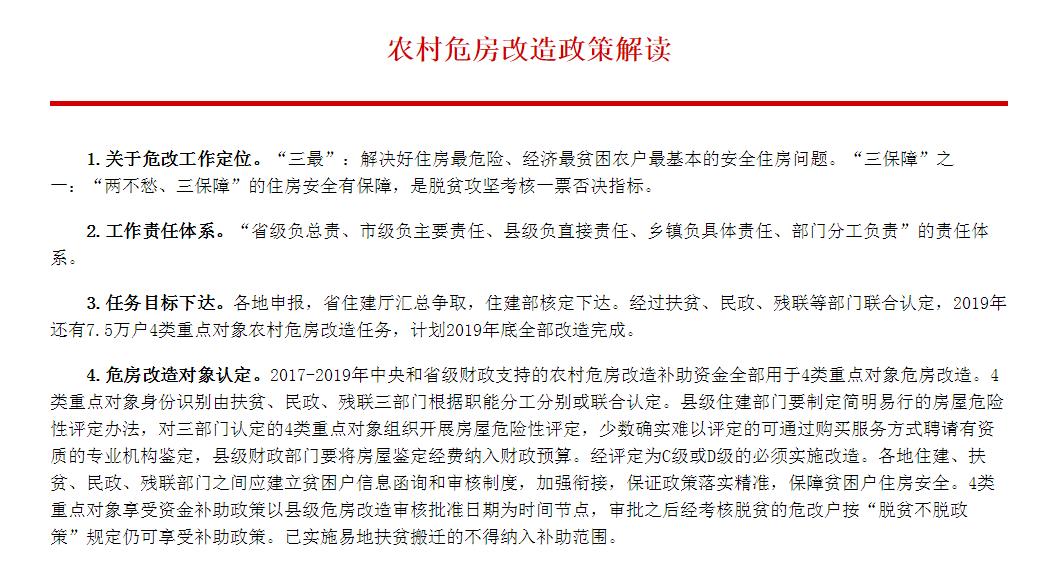 2.农村危房改造。严格按照“户申请、组评议、村评议公示、乡镇审核公示、县批准”的程序,阳光操作,透明化管理。指导各地认真落实危房改造项目资金公告公示工作,制作《农村危房改造政策明白卡》免费发放到每个危改户,让广大农民群众充分了解和掌握农村危房改造补助对象、补助标准、申请程序、建设方式、工作要求等基本政策。县级住建部门设立农村危房改造举报电话,在各村村务公开栏显著位置公示。通过做爱漫画 网站公开农村危房改造政策文件、工作进展情况等。2019年8月,发布了《农村危房改造政策解读》,重点就农村危房改造工作定位、工作责任体系、任务目标下达、危房改造对象认定、审批程序、改造方式、补助标准、面积标准、质量管控、检查验收、资金拨付、档案建立、信息录入、政策宣传、业务培训等15个方面做了介绍;10月,开展湖北省基本住房安全方面漠视侵害群众利益问题专项整治,公布了省级及各市(县)举报电话共107个。